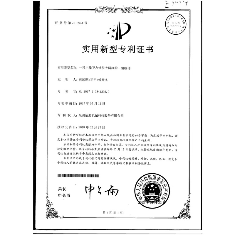 一種三線衛(wèi)衣針織大圓機的三角組件
